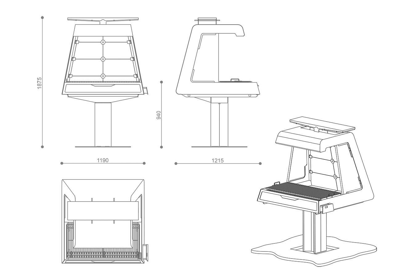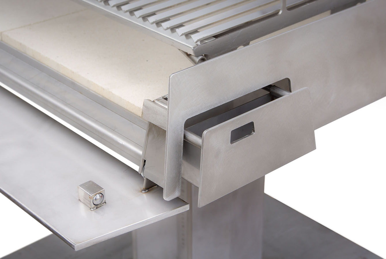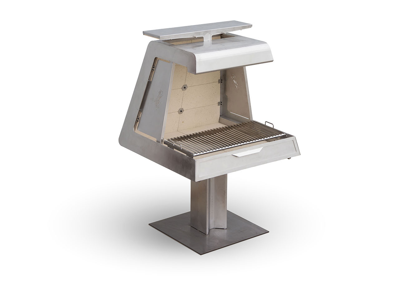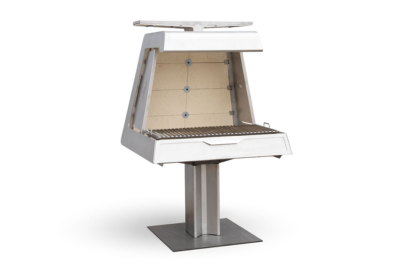 La griglia regolabile in altezza su tre diverse posizioni consente un controllo preciso della cottura, mentre sul lato destro è integrato un cassetto per la raccolta dell’olio, pensato per garantire praticità e pulizia. La base inferiore può essere annegata nella pavimentazione, rendendo la struttura visivamente più leggera e valorizzando ulteriormente il design essenziale del barbecue.
