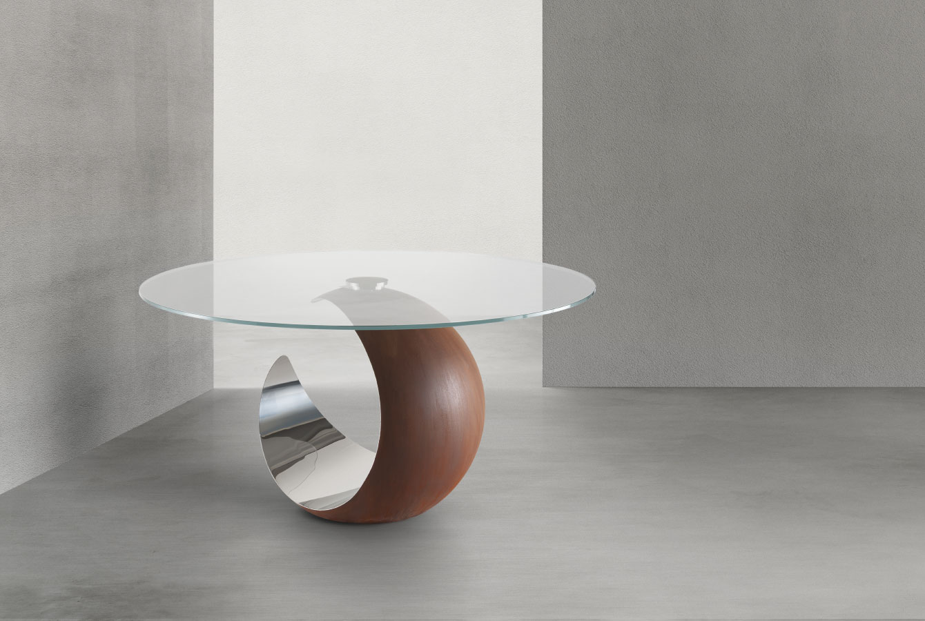 Un flusso morbido e sinuoso rievoca con eleganza l’eclissi della luna. Materiali nobili come l’acciaio inox e l’acciaio ossidato vengono sapientemente fusi dalle mani di maestri artigiani, dando vita a qualcosa che va oltre il semplice arredo. La base in acciaio ossidato è rifinita fino a ottenere una superficie lucida a specchio, trasformandosi in una vera e propria opera d’arte. Il piano in vetro cristallino consente una visione libera e completa della base scolpita.